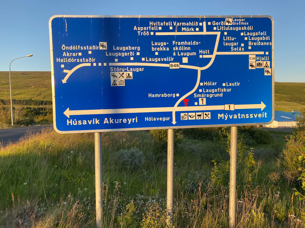 Wir stehen am 18. Juli wirklich früh auf, denn heute liegt viel Strecke vor uns. Ein kurzer Blick auf die typisch isländischen Straßenschilder erklärt, warum man sich hier zumindest in der Nähe kaum verfährt: Jedes einzelne Haus ist darauf abgebildet – sehr übersichtlich. Allerdings stelle ich mir jetzt das Ganze mal in Neuss vor – und wie lang dann die Rotphasen an den Ampeln sein müssten…