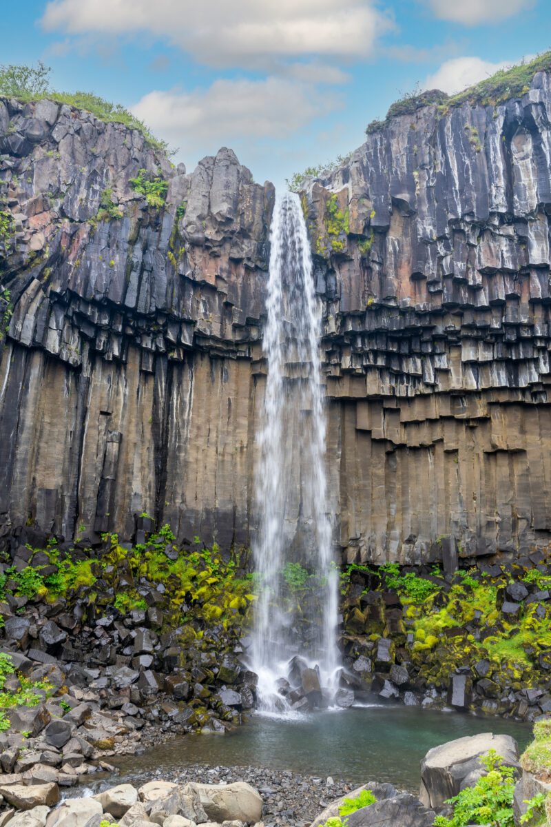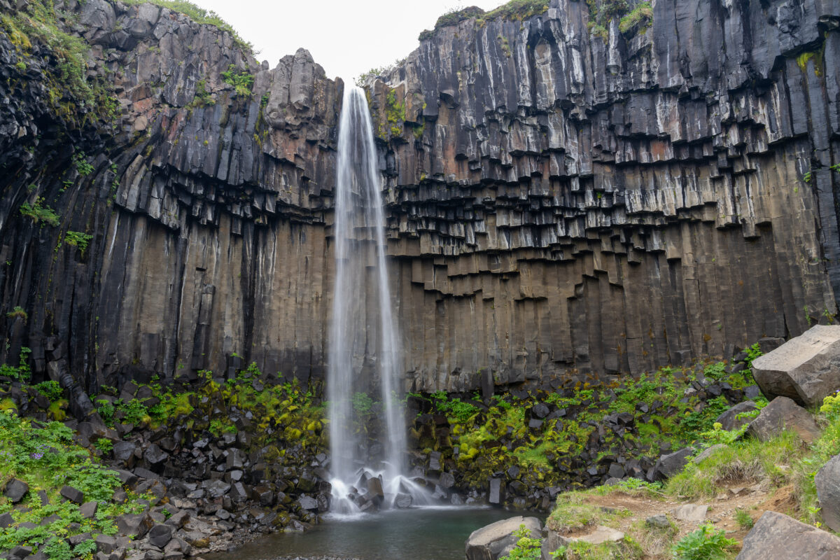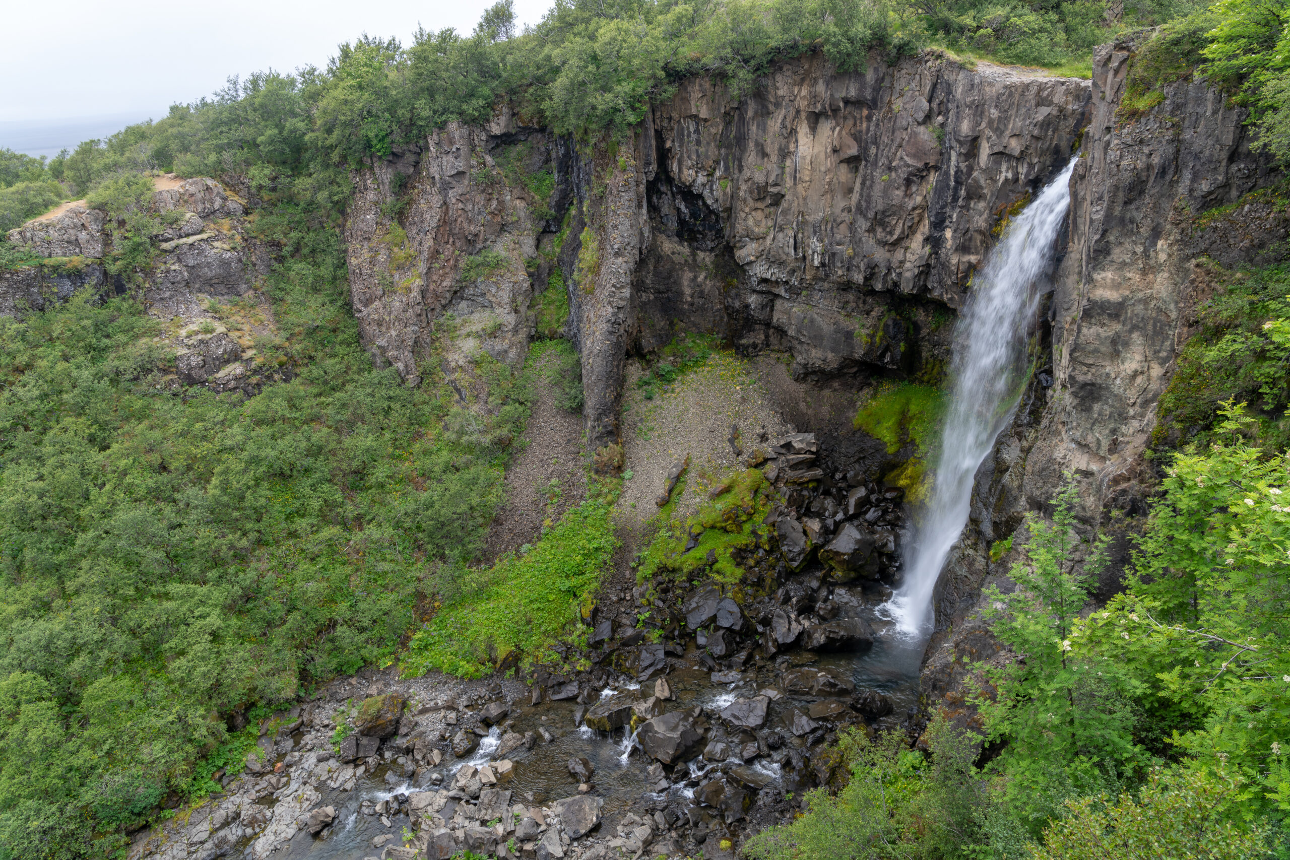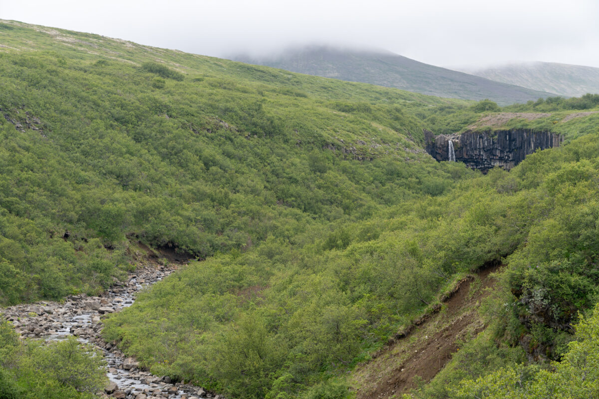 Umso überraschender ist der Moment, als wir den Svartifoss plötzlich von oben sehen. Man nähert sich dem Wasserfall hier nicht zuerst von unten, sondern blickt von oben in die Schlucht hinein – ein Perspektivwechsel, der sich auch auf den Fotos gut zeigt.