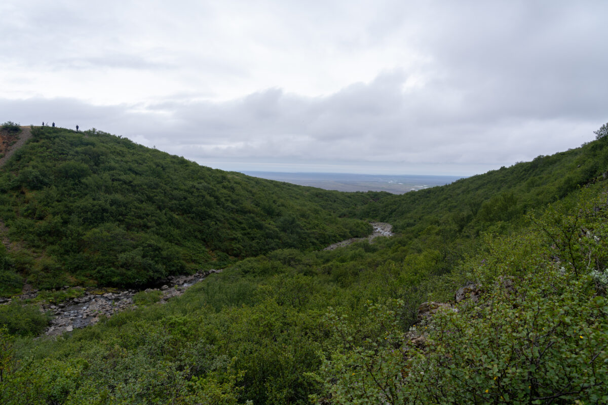 Für den Rückweg nehmen wir nicht den direkten Weg, sondern gehen einen Umweg. Auch hier geht es zunächst noch einmal ordentlich stufenhoch, aber die Landschaft entschädigt dafür. Viel Grün, weite Blicke und diese typische Ruhe, die man in Island immer wieder erlebt.