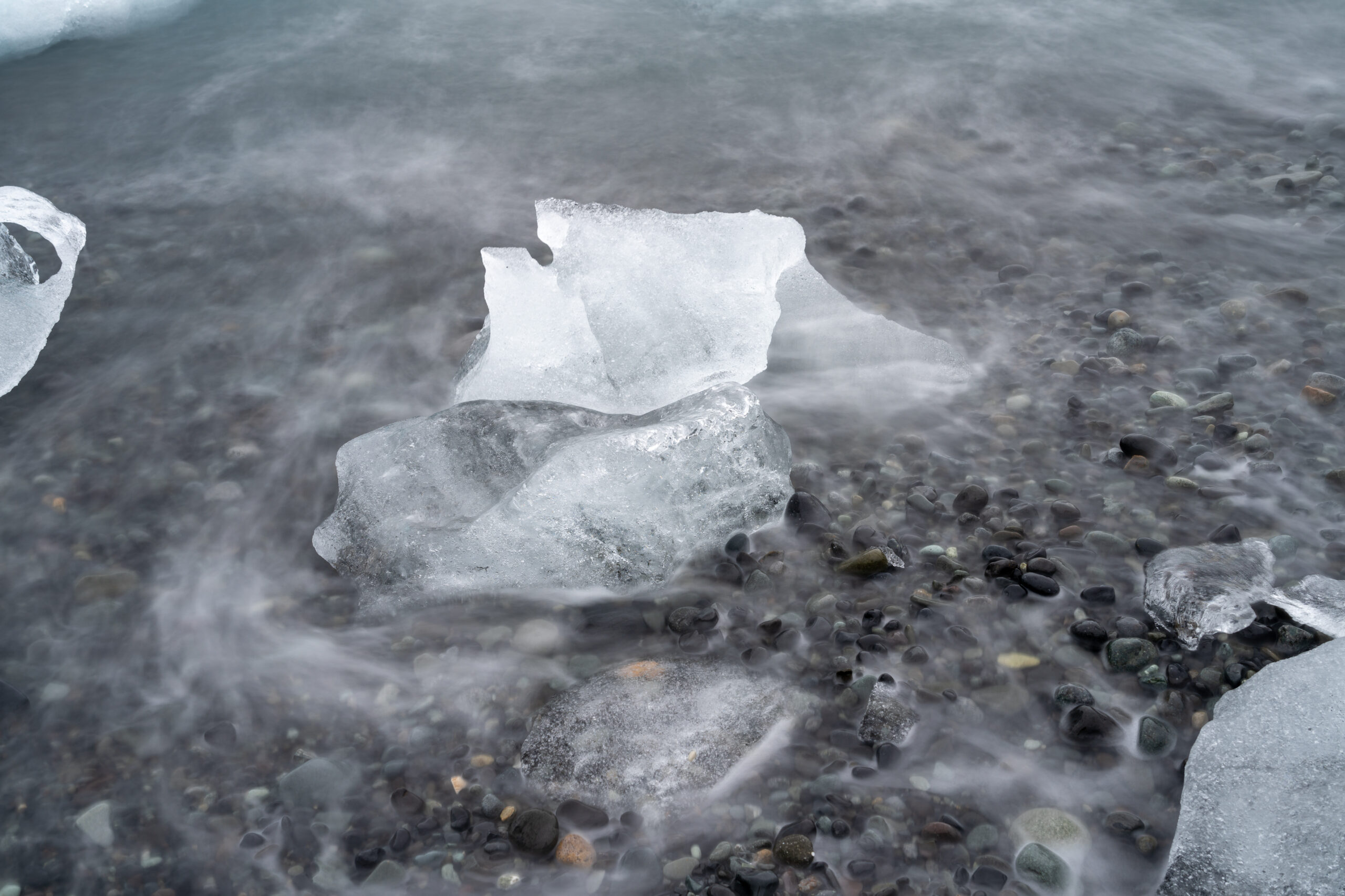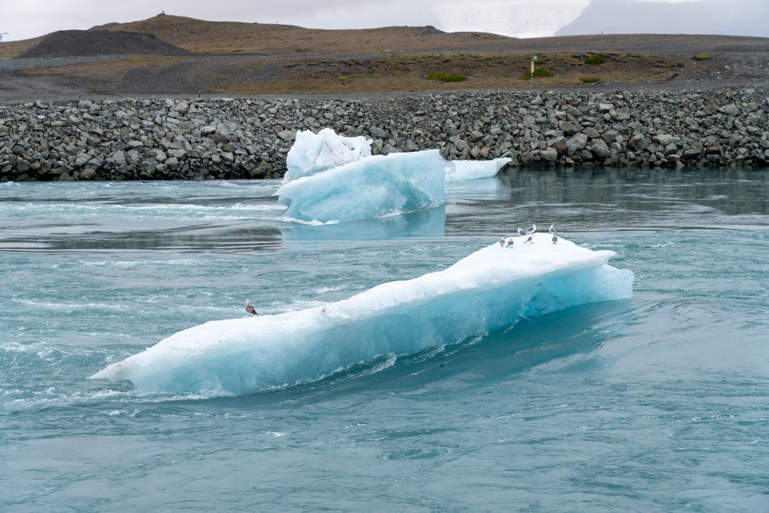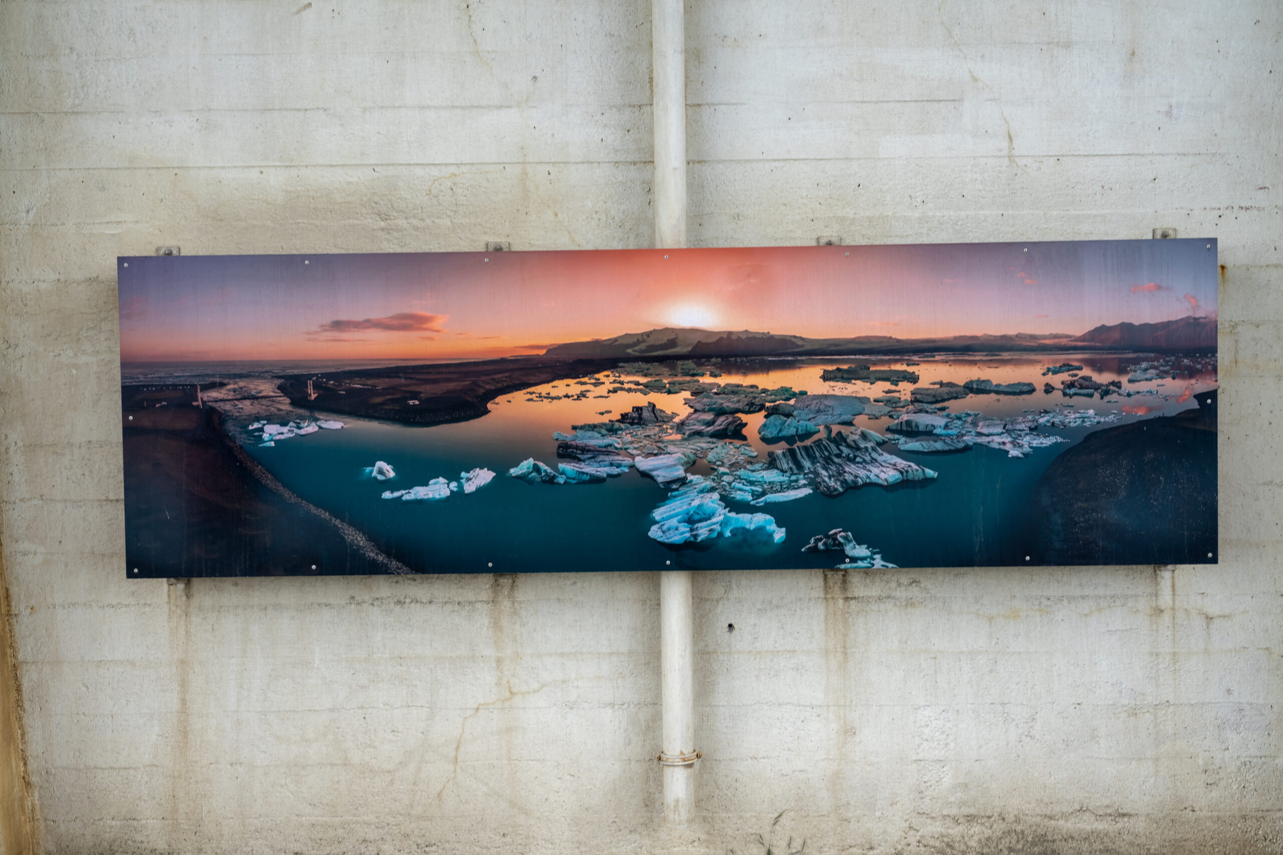 Am Nachmittag können wir es nicht lassen und fahren noch einmal zum Jökulsárlón. Wir schauen uns um, hoffen auf den Sonnenuntergang und beobachten die Eisschollen, auf denen immer wieder Tiere vorbeiziehen. Unter der Brücke bewundern wir das große Gemälde mit dem bekannten Drohnenmotiv des Jökulsárlón – ein spannender Kontrast zur realen Landschaft. Danach geht es noch kurz zum Diamond Beach, bevor wir den Tag langsam ausklingen lassen.