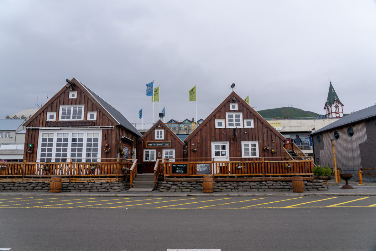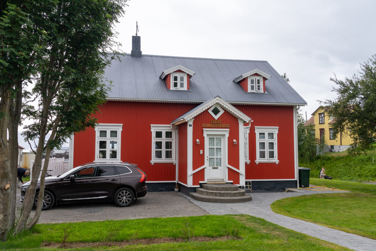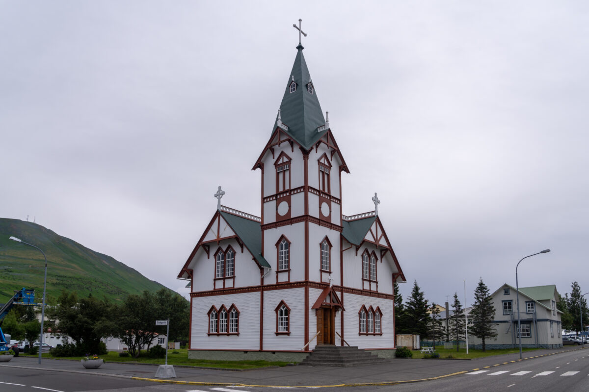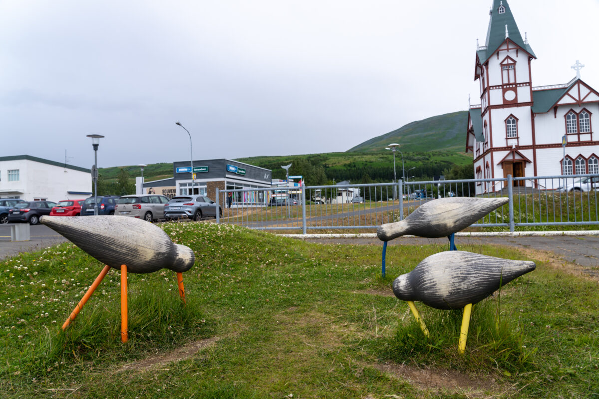 In Húsavík, der oft als Walhauptstadt des Nordens bezeichnet wird, schlendern wir zuerst am Hafen entlang und durch das kleine Städtchen. Whale Watching steht kurz zur Debatte – wir haben das auf dieser Reise ja bereits gemacht und sogar Glück gehabt. Das Wetter ist heute allerdings eher durchwachsen, das Wasser sichtbar unruhig, und da ich zur Seekrankheit neige, entscheiden wir uns vernünftigerweise dagegen. Stattdessen genießen wir Húsavík ganz in Ruhe: die hübsche Kirche, ein paar Kunstwerke davor und das angenehme, unaufgeregte Flair dieses Ortes.