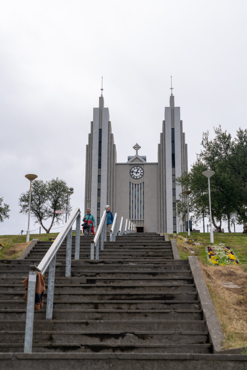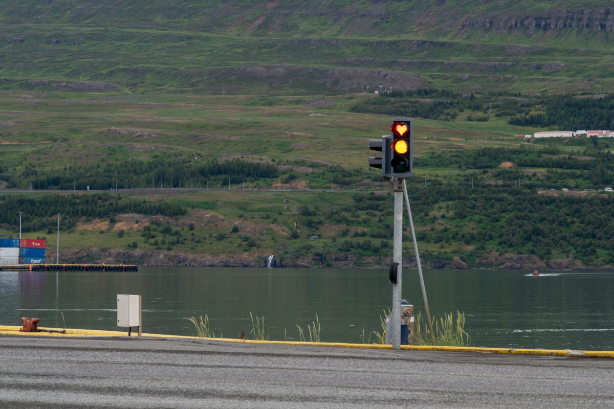 Danach geht es weiter nach Akureyri, wo wir bereits zuvor waren. Trotzdem lohnt sich der Stopp erneut. Wir steigen die lange Treppe hinauf zur markanten Akureyrarkirkja am oberen Ende und lassen den Blick über die Stadt schweifen. Anschließend bummeln wir durch die Fußgängerzone. Akureyri mag zwar als „Hauptstadt des Nordens“ gelten, ist aber selbst für deutsche Verhältnisse eher kleinstädtisch – Reykjavik ist da eine ganz andere Liga. Genau das macht den Charme aus: liebevoll bepflanzte Ecken, kurze Wege und diese berühmten Ampeln, bei denen im roten Licht kleine Herzchen leuchten.