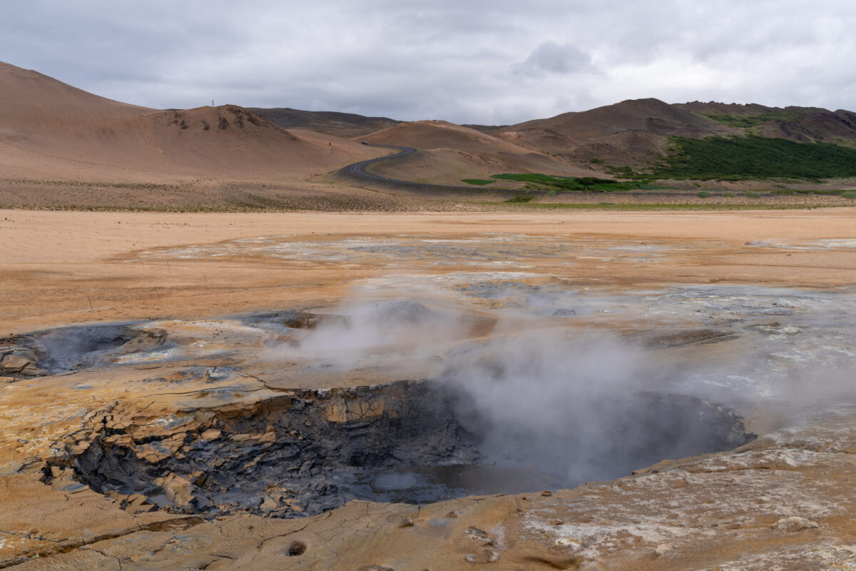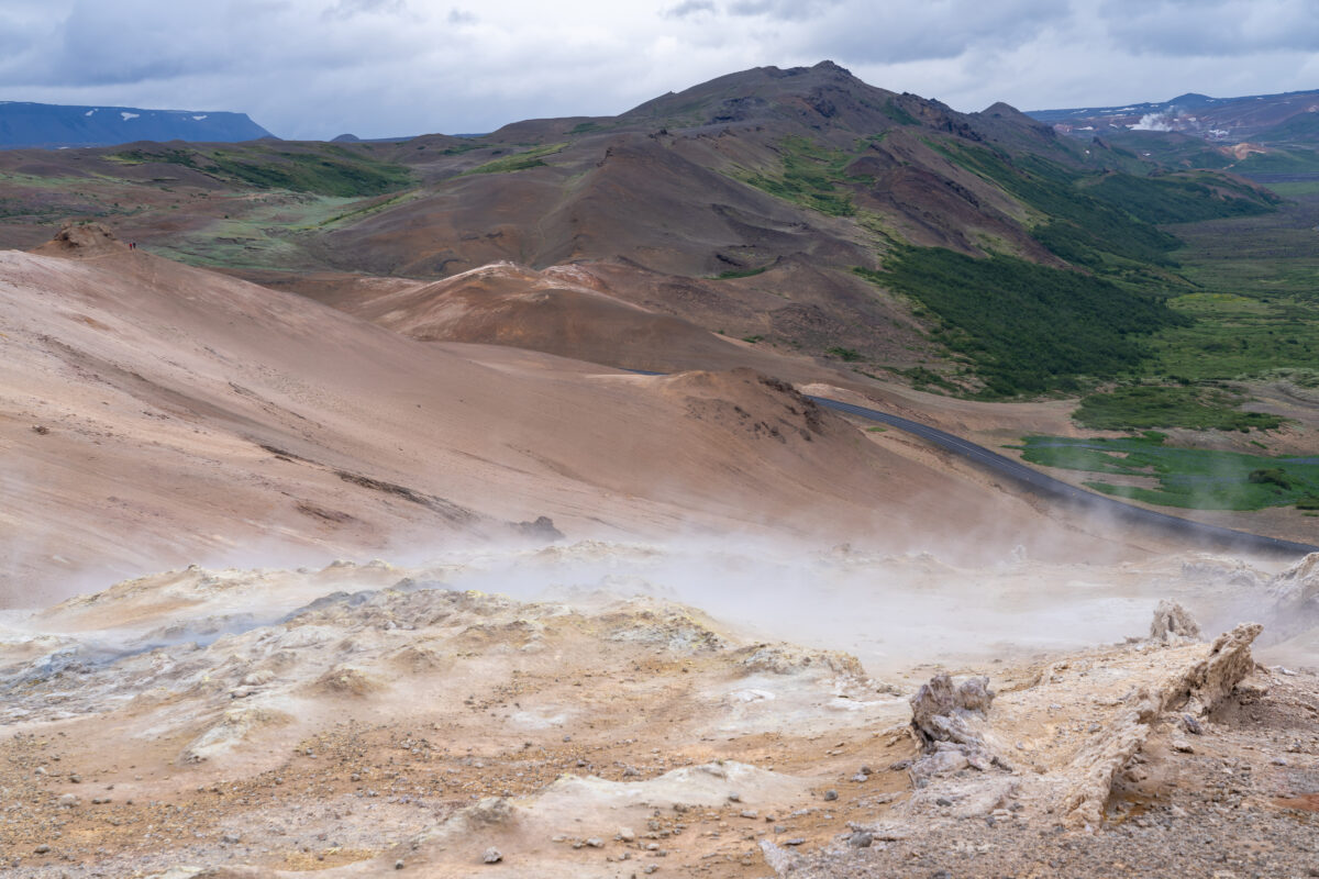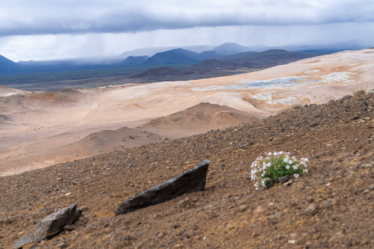 Unser nächstes Ziel ist ein echtes Kontrastprogramm: das Geothermalgebiet Hverir am Námafjall (auch als Hverarönd bekannt). Hier qualmt, zischt und stinkt es ordentlich nach Schwefel – Island in Reinform. Neben den dampfenden Fumarolen gibt es einen wunderschönen Rundwanderweg. Der beginnt direkt mit einem recht steilen Anstieg, bei dem wir auf dem sandigen Untergrund ein paar Mal leicht zurückrutschen. Oben angekommen werden wir mit einem großartigen Blick über das gesamte Thermalgebiet belohnt. Besonders faszinierend sind die Farben: Stellenweise wechseln sie abrupt von Pink und Lila zu Orange und kräftigem Rot. Überraschend entdecken wir sogar kleine Pflänzchen – richtige Blumenbüschel –, die sich hier irgendwie behaupten.