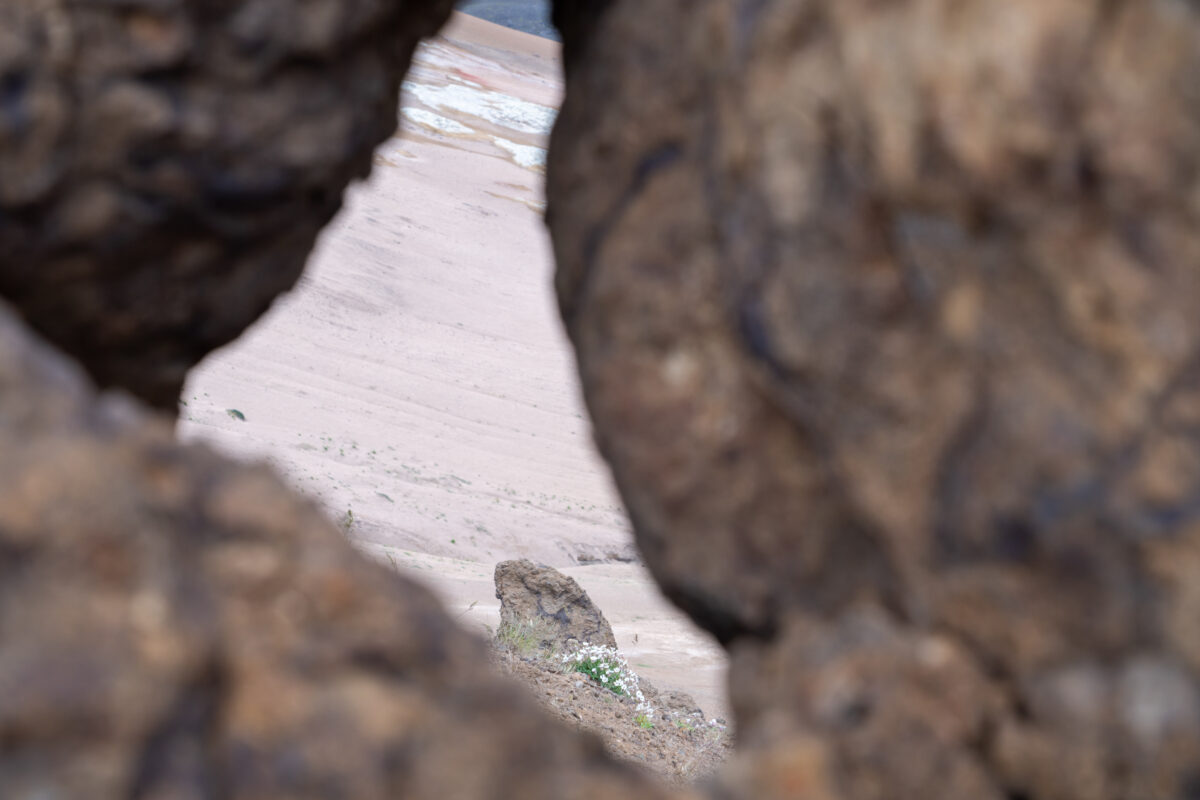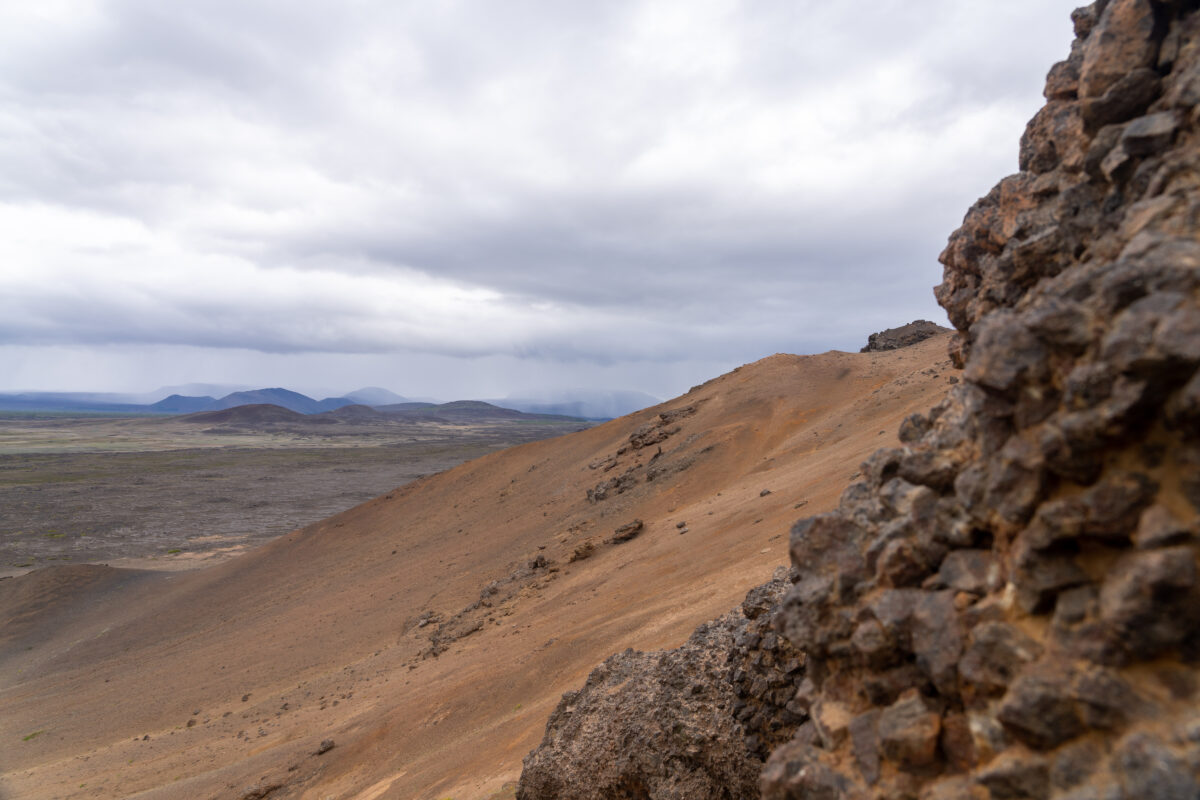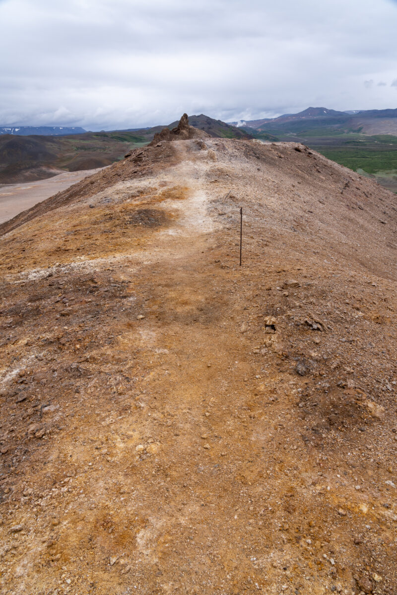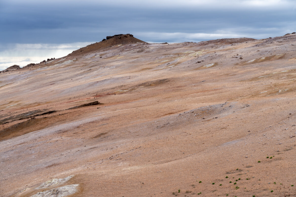Unser nächstes Ziel ist ein echtes Kontrastprogramm: das Geothermalgebiet Hverir am Námafjall (auch als Hverarönd bekannt). Hier qualmt, zischt und stinkt es ordentlich nach Schwefel – Island in Reinform. Neben den dampfenden Fumarolen gibt es einen wunderschönen Rundwanderweg. Der beginnt direkt mit einem recht steilen Anstieg, bei dem wir auf dem sandigen Untergrund ein paar Mal leicht zurückrutschen. Oben angekommen werden wir mit einem großartigen Blick über das gesamte Thermalgebiet belohnt. Besonders faszinierend sind die Farben: Stellenweise wechseln sie abrupt von Pink und Lila zu Orange und kräftigem Rot. Überraschend entdecken wir sogar kleine Pflänzchen – richtige Blumenbüschel –, die sich hier irgendwie behaupten.