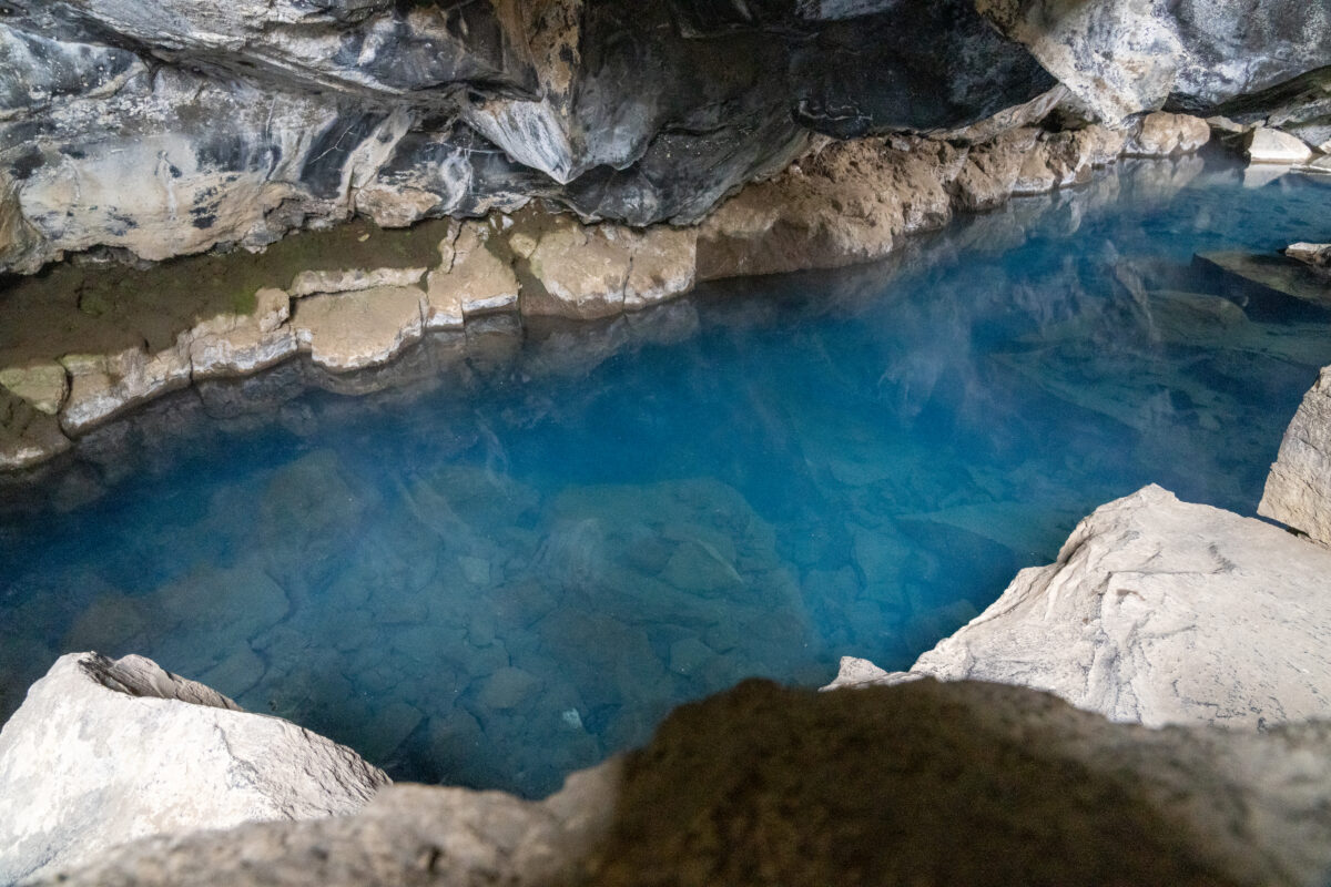 Ganz in der Nähe schauen wir uns noch Grjótagjá an. Die Lavahöhle ist vor allem durch Game of Thrones bekannt: Hier wurde die Liebesszene zwischen Jon Snow und Ygritte gedreht. Einen Wasserfall gibt es dort allerdings nicht – der wurde für die Serie künstlich ergänzt. Trotzdem ist die Höhle mit dem warmen, türkis schimmernden Wasser unglaublich stimmungsvoll.