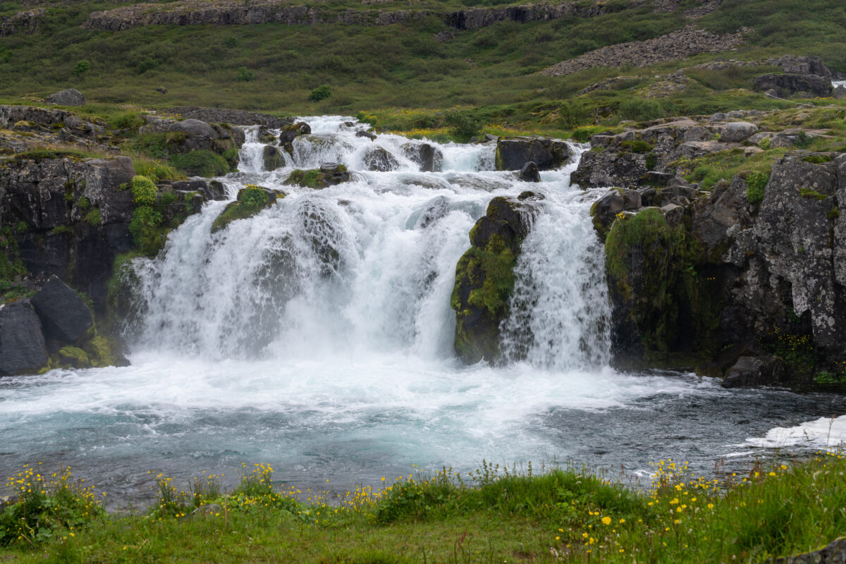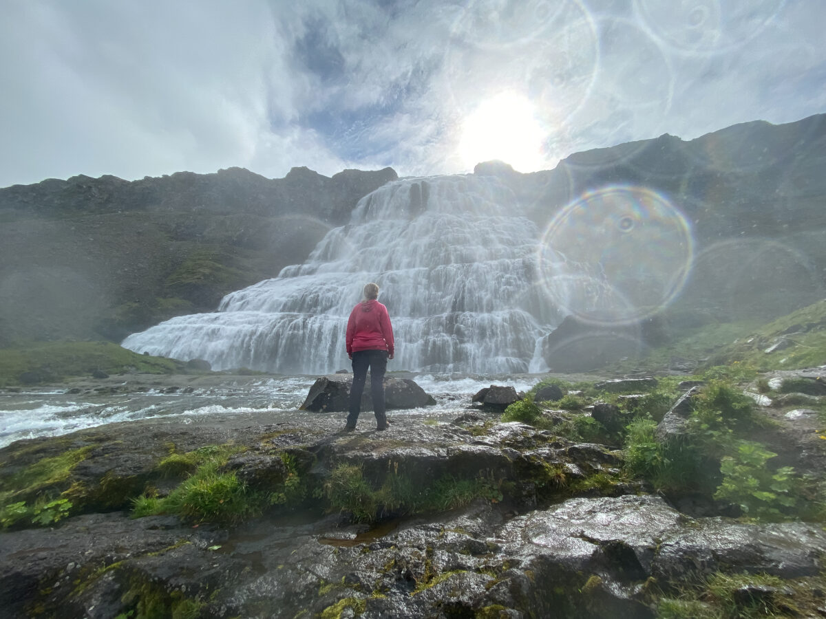 Es ging zum Dynjandi, dem quasi donnernden Wasserfall. Dynjandi heißt auch übersetzt „der Donnernde“. Wir sind ganz normal aufgestanden und haben gefrühstückt. Das Schöne in Island im Sommer ist ja, dass es quasi Tag und Nacht hell ist. Man muss sich überhaupt nicht beeilen, weil es dunkel werden könnte. Man kann einfach seinem eigenen Rhythmus folgen – und mittlerweile waren wir auch wirklich angekommen und entspannt.
