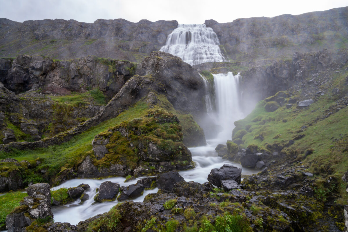 Der Weg hinauf führt vorbei an mehreren kleineren Wasserfällen – ich meine, es waren sieben – die sich wie eine kleine Kaskadentreppe unterhalb des großen Hauptfalls aneinanderreihen. Wir fotografieren natürlich jede einzelne Stufe, spielen mit Belichtungszeiten und Perspektiven. Der Dynjandi selbst wirkt von unten nach oben gewaltig, aber genauso beeindruckend ist der Blick von oben nach unten: wie steil sich das Wasser durch die Gesteinsschichten gräbt, wie es nicht streng linear fällt, sondern sich leicht schlängelt, über Kanten bricht und in Fächern auffächert.