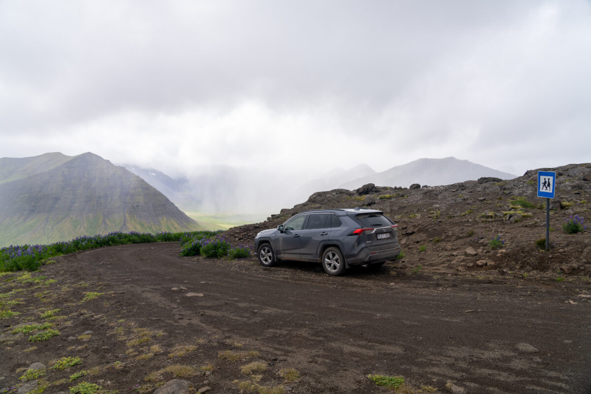 Die Fahrt zum Dynjandi zog sich – wenn ich mich recht erinnere, waren es anderthalb bis zwei Stunden. Das Wetter war nicht ganz so prickelnd, entsprechend war es auch nicht übermäßig voll. Am Parkplatz sah man schon viele Vorbereitungen für Ladesäulen, allerdings eher für Hybrid- und normale Autos als für reine E-Autos. Wobei man in Island ja fast denkt, Energie wird frei Haus geliefert.