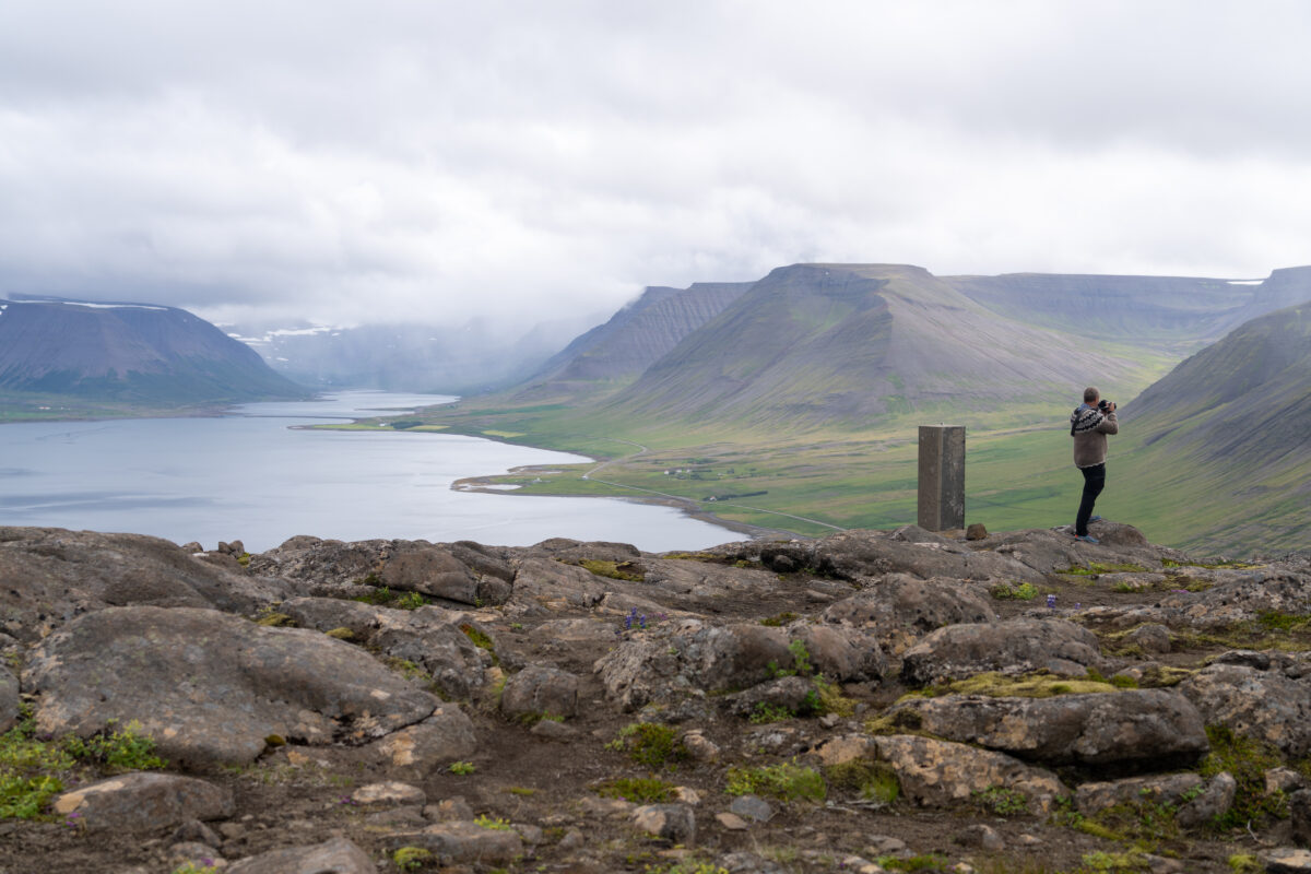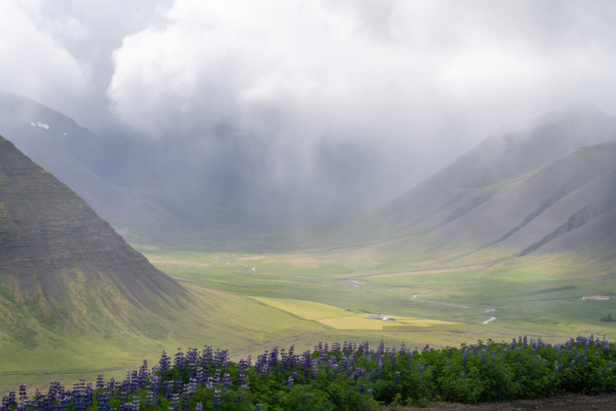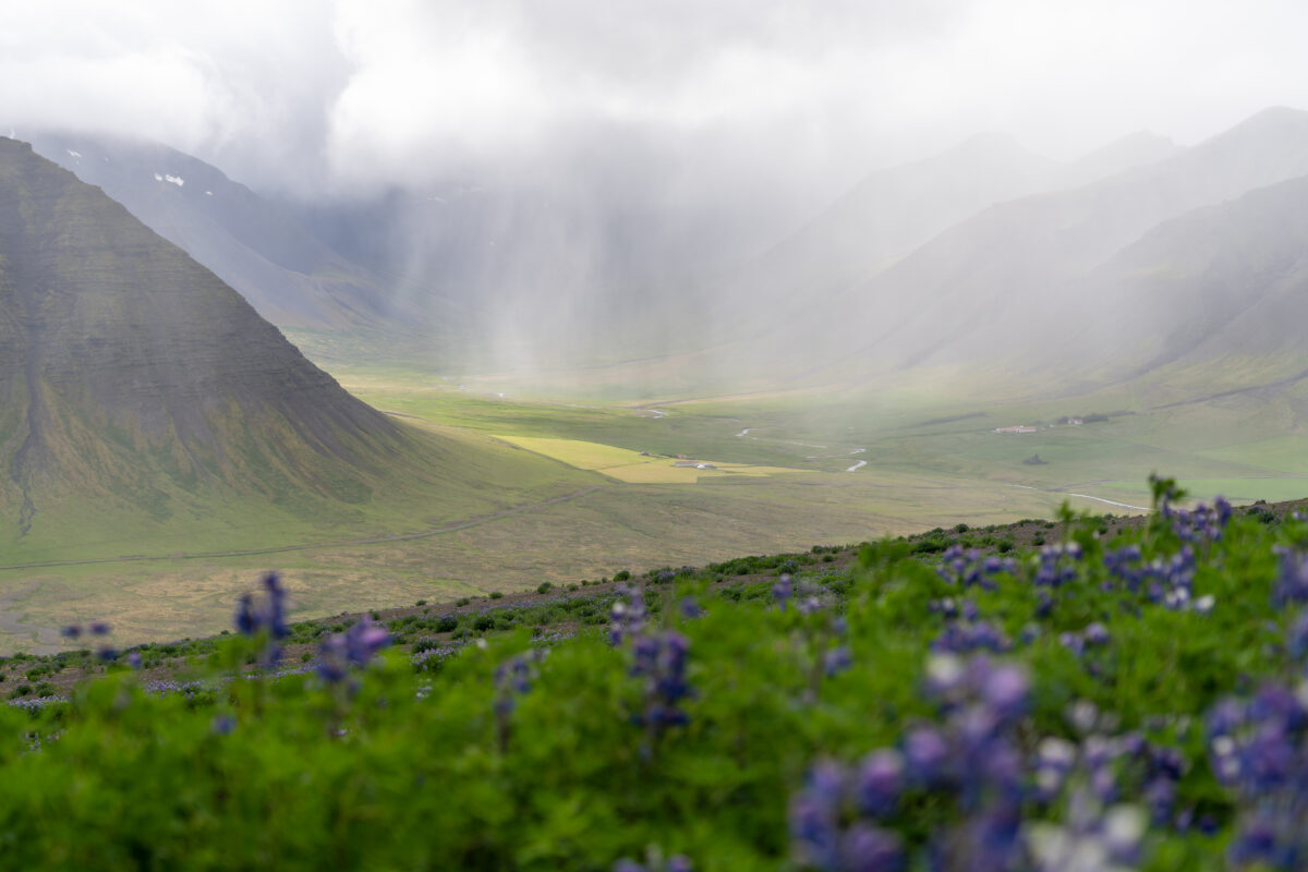 Dann beschlossen wir, auf den Bolungarvík hinaufzufahren – den Hausberg bei Isafjörður – um unserem Hobby nachzugehen: dem Cachen. Oben erwarteten uns fantastische Ausblicke: Berge, Täler, deutlich erkennbare ehemalige Fjorde, Lupinen im Vordergrund, Nebel und Sonnenstrahlen, die sich ihren Weg durch die Wolken bahnten. Dank des vielen Regens waren unsere Schuhe inzwischen ordentlich matschig. Wir suchten ein paar Geocaches, schauten uns den kleinen, alten Leuchtturm an und genossen einfach diese Weite.